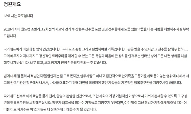 청원자는 “국가대표이기 이전에 한 명의 인간이다. 너무나도 소중한 그리고 평범해야할 가족이다. 비판은 받을 수 있지만 그 선수를 살해 위협하고, 그의 배우자와 자녀까지도 정신적인 트라우마를 겪게 할 수 있는 모든 욕설과 마음에 큰 상처를 안겨주는 인터넷상의 모든 나쁜 행위를 처벌해주시기 바란다. 너무 많고, 보호 장치가 전혀 작동되지 안 되는 것 같다”고 꼬집었다.