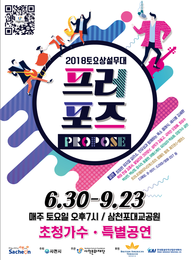 사천문화재단이 주관하는 2018 토요상설무대 PROPOSE(프러포즈)는 30일 개막공연을 시작으로 9월 23일(한가위프러포즈)까지 삼천포대교공원에서 오후 7시부터 총11회 펼쳐지게 된다.