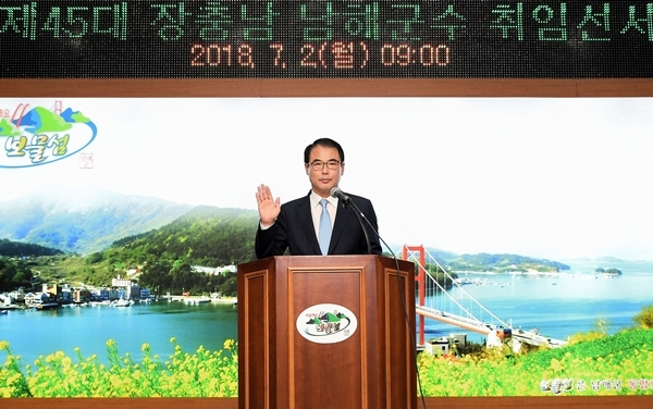 장 군수는 취임선서에서 “법령을 준수하고 주민의 복리 증진 및 지역사회의 발전과 국가시책의 구현을 위해 남해군수로서의 직책을 성실히 수행하겠다”고 군민들에게 약속했다.