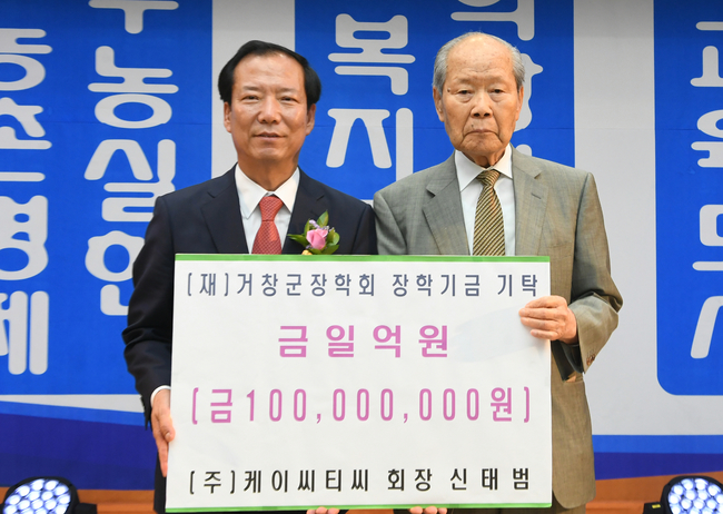 경남 거창군 위천면 황산마을 출신 ㈜케이씨티씨 신태범 회장이 (재)거창군장학회(이사장 구인모 거창군수)에 장학금 1억 원을 기탁했다.