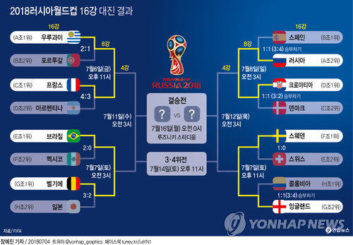 이로써 8강은 우루과이 대 프랑스, 브라질 대 벨기에, 러시아 대 크로아티아, 스웨덴 대 잉글랜드 대진이 성사됐다.