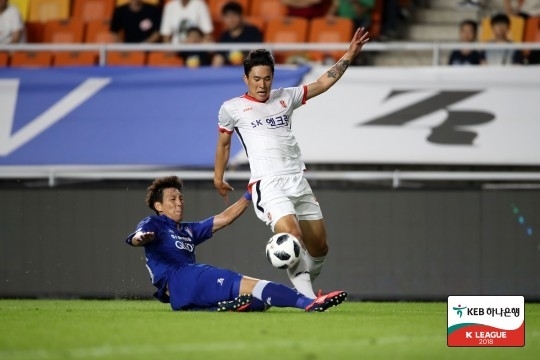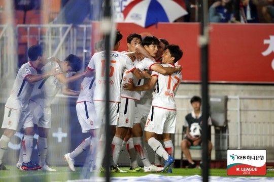 전반 22분 원정팀 제주가 선제골을 넣었다. 먼 거리 프리킥 상황에서 권순형이 올린 크로스를 권한진이 정확히 머리에 갖다 댔다. 볼이 골키퍼 노동건 다리 맞고 골문 안으로 흘러 들어갔다.