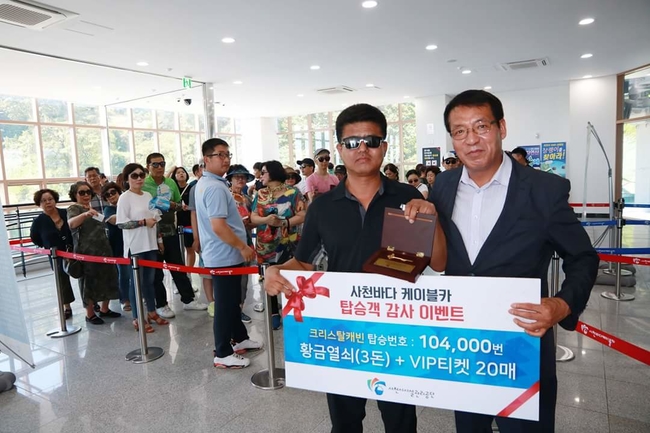 사천시시설관리공단에 따르면 지난 15일 오후 3시께 경남 하동에서 온 김용재(47) 씨가 크리스털 캐빈(투명유리 바닥 케이블카) 10만4000번째 탑승객 이벤트에 당첨됐다.
