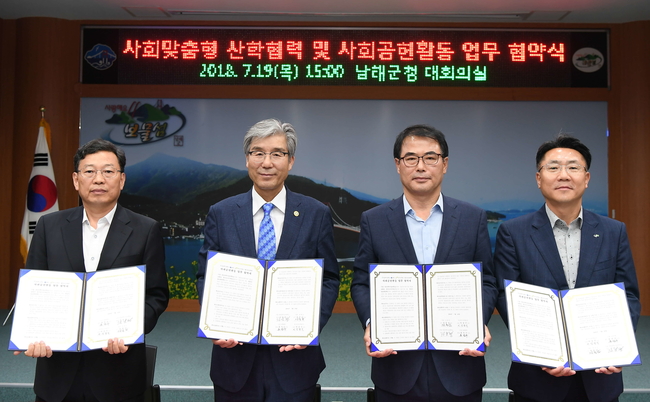 경남 남해군과 경남과학기술대학교, 한국토지주택공사(LH), 경남도립남해대학이 마을·주거환경개선 사회공헌활동을 위한 업무 협약을 체결했다.