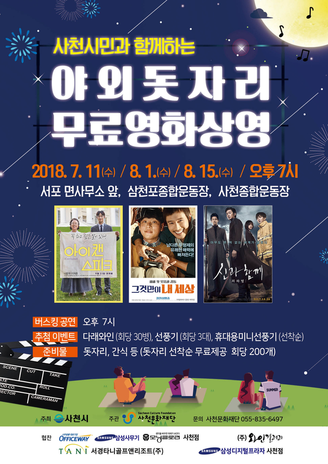 사천문화재단은 ‘야외 돗자리 무료 영화’를 8월 1일, 8월 15일 서포면사무소 주차장, 삼천포종합운동장, 사천종합운동에서 오후 7시 가정의 날인 수요일에 상영한다.