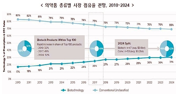 특히 전체 의약품산업에서 바이오의약품 시장은 2017년 25%에서 2024년 31%로 확대될 것으로 전망했으며, 매출로는 상위 100대 제품 내 비중이 52%(2017년 49%)를 차지할 것으로 예측했다.