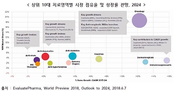 EvaluatePharma World Preview 2018에 따르면 글로벌 처방의약품 매출액은 2018년 8300억 달러(약 938조원)에서 연평균 6.4% 성장해 2024년에는 1조2000억 달러(약 1355조원)에 이를 것으로 전망됐다.