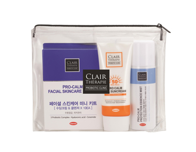 이번에 출시된 여행용 키트는 약국 화장품 브랜드 ‘클레어테라피 프로-캄’ 라인으로, 비타 썬크림과 에센스 미스트 세트로 구성됐다. 또 페이셜 수딩크림 및 수딩 딥 액션 토탈 클렌져 2ml 샘플 10개가 동봉됐다.