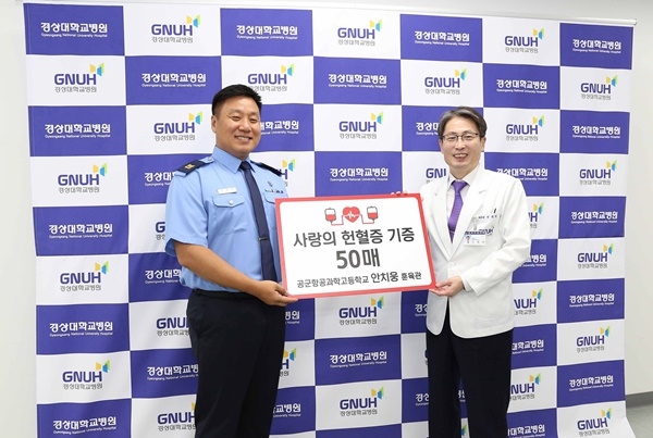 공군교육사령부 항공과학고등학교 학생훈육관 안치웅 상사(사진 왼쪽)가 지난 20여년간 모아왔던 헌혈증 50장을 경상대학교병원에 기증했다.