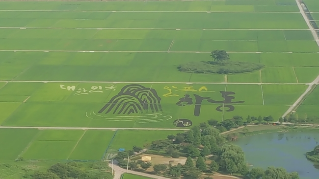 경남 하동군이 평사리 들판에 다섯 가지 색깔 벼로 들녘아트를 설치했다.