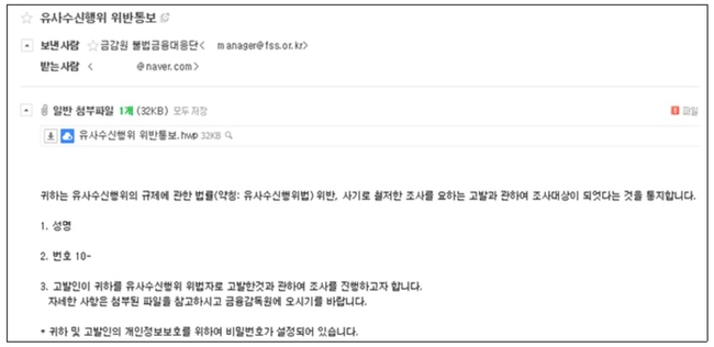 가짜 이메일에는 수신자에게 유사수신행위법 위반 및 사기 고발 사건과 관련해 금감원의 조사대상이 됐음을 통지하고 있다. 또한 조사를 위해 주민등록증 및 은행 통장을 준비해 금감원에 오는 13일까지 오라는 내용이 담겼다.