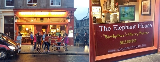 우리 가이드는 조앤 롤링이 에든버러에서 일할 때 엘리펀트 하우스의 주인이 시외에 있는 집으로 가는 버스를 기다릴 때 편의를 봐주었다고 설명했다. 버스가 너무 드물게 있어 기다리는 동안 추위를 피할 곳이 필요했다는 것이다. 주인의 그런 호의를 갚겠다는 롤링에게 주인은 해리포터 연작의 초판본을 부탁했다고 한다. 엘리펀트 하우스의 전면에는 해리 포터가 탄생한 곳이라고 적혀있고, 뒤편 홀에는 조앤 롤링에게 고정적으로 제공한 좌석이 있다고 표시하고 있다.