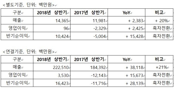 2018년 상반기 반기보고서 공시자료에 따르면 상반기 누적 매출액은 전년 동기 대비 24억원(20%) 증가한 144억원, 순이익은 104억원이다. 연결 재무제표를 기준으로 2018년 상반기 매출액은 2225억원, 영업이익은 35억원을 기록했다.