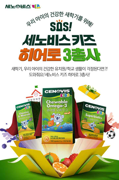 ‘SOS! 히어로3총사’ 캠페인은 8월20일부터 9월7일까지 진행ehlse 캠페인 기간 동안에는 ▲수퍼바이오틱스 ▲츄어블 오메가-3(EPA 및 DHA함유유지) ▲멀티비타민미네랄로 구성된 다양한 ‘히어로 3총사’ 패키지를 ‘최대 30% 할인’, ‘미니 샘플 등 추가 증정’, ‘네임 스티커 증정’ 등의 혜택이 제공된다. 또한 세노비스 공식몰 신규 회원에게는 10% 할인쿠폰도 제공한다.