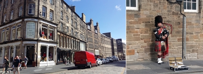 홀리루드궁전에서 에든버러성까지의 1.61㎞의 길을 로열마일(Royal mile)거리라고 한다. 영국이 사용하는 거리의 단위 마일이 여기에서 나왔다. 에든버러성을 찾는 사람들이 너무 많았나 보다. 로열마일이 성으로 향하는 차들로 가득 차 있어서 버스가 나가지 못해 결국 내려서 걷기로 했다. 이래저래 많이 걷는 여행이다. 전날 방에 보았던 성 자일스 교회를 밝은 날 다시 보았다. 역시 교회 안을 구경할 시간은 없었다. 거리에서 백파이프를 연주하는 거리의 악사를 만났다.