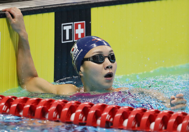 24일 인도네시아 자카르타의 겔로라 붕 카르노(GBK) 수영장에서 열린 2018 자카르타-팔렘방 아시안게임 수영 경영 여자 개인혼영 200m 결승에서 김 선수는 결승선을 가장 먼저 통과했다.