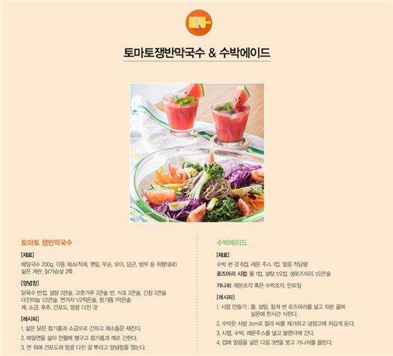 “오늘은 대표적인 여름 채소인 토마토와 여름 과일인 수박을 이용한 요리를 준비했다. 제철과일이나 채소를 많이 먹으면 좋은 게 제철에 꼭 필요한 영양소가 담겨있기 때문이다. 라이코펜이 많이 들어 있는 토마토는 자외선을 차단하는 효과가 있고 메밀의 찬 성분은 무더위로 지친 사람들을 시원하게 해준다. 수박은 이뇨작용이 있어서 요로결석에 좋다. 특히 오늘 만드는 수박에이드는 처치곤란인 맛없는 수박을 활용해서 만들 수도 있어 더 좋다.”-박민재 소믈리에-