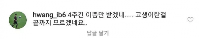 이후 황인범은 “4주간 예쁨만 받겠네. 고생이라는 걸 끝까지 모르겠네요”라는 댓글을 달았다. 황인범이 이번 아시안게임이 끝나기 전까지 군인 신분이었던 점을 감안하면 ‘4주간 기초군사훈련만 해도 돼서 좋겠다’라는 의미로 풀이된다.