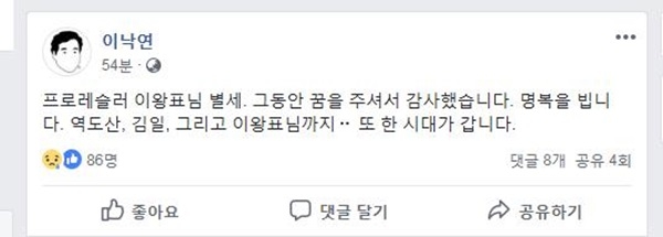 이 총리는 4일 자신의 페이스북에 “역도산, 김일, 그리고 이왕표님까지…또 한 시대가 간다”고 짧은 글을 남겼다. 이어 “그동안 꿈을 주셔서 감사드린다. 명복을 빈다”고 애도를 표했다.