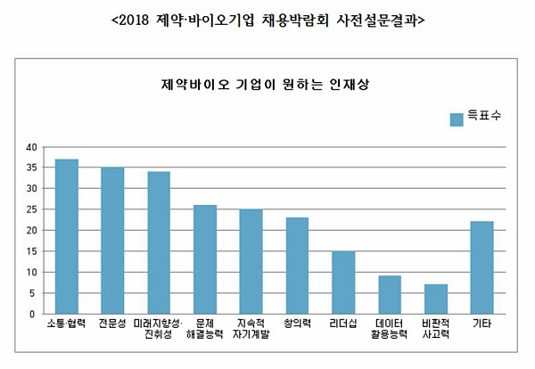 한국제약바이오협회가 2018 한국 제약·바이오산업 채용박람회와 관련해 회원사를 대상으로 진행한 사전 설문조사에서 45개 기업의 인사실무자들이 이같이 응답한 것으로 나타났다.