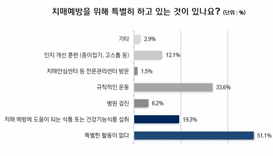 반면 ‘본인의 치매 예방을 위해 무엇을 하는가’에 대한 질문에는 과반수 이상인 51.1%가 ‘특별한 활동을 하지 않는다’고 답했다. 이 중 67.3%는 ‘아직 치매를 걱정할 나이는 아닌 것 같아서’라고 답했으며, 13.1%는 ‘알려진 치매 예방 방법은 효과가 크지 않을 것 같아서’, 12.3%는 ‘치매는 피할 수 없는 노화 현상이기 때문에’라고 답하기도 했다.