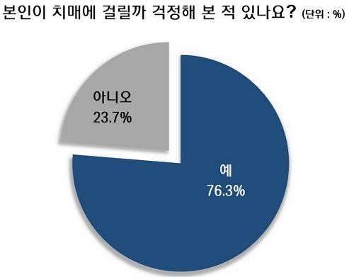 그 결과, 40대 이상 성인 남녀는 치매에 대한 두려움이 큰 것으로 나타났다. ‘치매 발생에 대해 걱정을 한 적이 있는가’라는 질문에 10명 중 7명(76.3%)이 ‘그렇다’고 답했다.