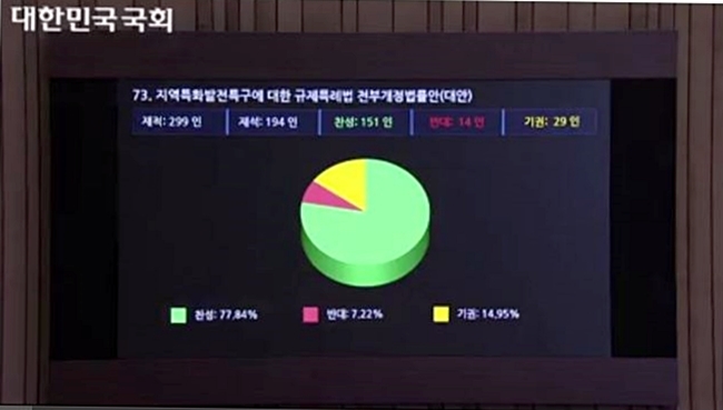 의료영리화를 촉진할 것이라고 우려하며 시민사회노동자단체를 비롯해 보건의료계가 강하게 반발해온 지역특화발전특구에 대한 규제특례법 전부개정법률안(대안)이 20일 재적인원 299명 중 194명이 재석한 가운데 151명(77.84%)이 찬성함에 따라 국회 본회의를 통과했다.
