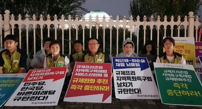 한편, 보건의료노조를 비롯해 무상의료운동본부 등은 이날 국회를 통과한 지역특구법을 과거 박근혜 정부에서 추진해온 '규제프리존법' 일명 '최순실법'으로 규정하고, 같은 시간 국회 앞 보도에서 법 폐지를 촉구하며 철야농성을 벌이고 있다.