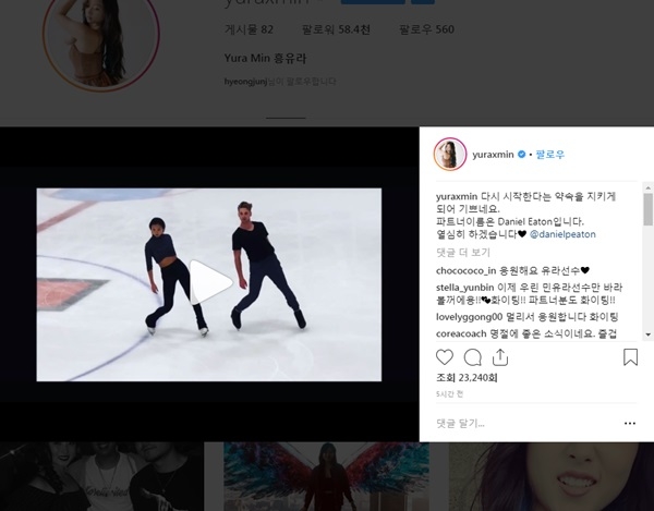 민유라는 22일 자신의 인스타그램 계정에 “다시 시작한다는 약속을 지키게 돼 기쁘네요. 파트너 이름은 대니얼 이튼입니다. 열심히 하겠습니다”라는 글과 함께 훈련 영상을 게시했다.