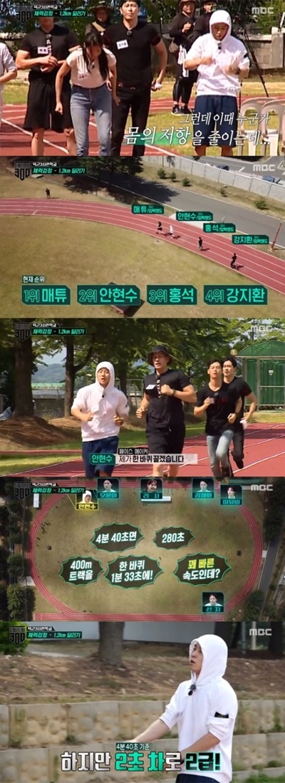 1.2km 달리기도 거뜬했다. 안현수는 다른 출연진들은 멀찍이 따돌리고 1등(4분42초)으로 들어왔다. 그러나 1급 기준(4분40초)에 2초 차이로 뒤져 2급을 받았다.