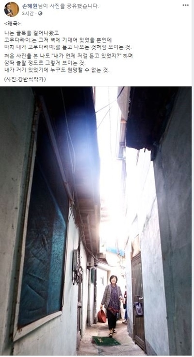 11일 손 의원은 자신의 페이스북에 “왜곡”이라는 말과 함께 사진 한 장을 올렸다. 사진 속 손 의원은 좁은 골목길에 서서 고무 대야 하나를 손에 들고 있다. 손 의원은 “나는 골목을 걸어 나왔고 고무대야는 그저 벽에 기대어 있었을 뿐인데 마치 내가 고무대야를 들고 나오는 것처럼 보이는 것”이라며 “사진을 처음 본 나도 ‘내가 언제 저걸 들고 있었지’라며 깜짝 놀랄 정도로 그렇게 보이는 것. 내가 거기 있었기에 누구도 원망할 수 없는 것”이라고 썼다. 국감에서의 단편적인 모습으로 인해 자신의 순수한 의도마저 곡해된 현 상황에 대한 답답함을 토로한 것으로 보인다.