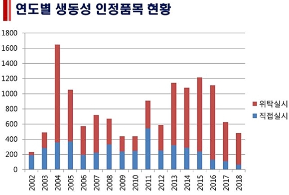 문제는 일련의 제네릭 중 대다수가 제약사 자체적인 생동성시험조차 거치지 못한 위탁·공동 시험을 통해 허가를 받은 제품이라는 점이다. 김 의원은 “2018년 상반기 기준 (제약사) 직접실시 생동성 인정품목은 13% 수준에 그쳤다. 나머지 87%는 위탁실시된 것”이라며 “위탁제도가 도입된 이후 직접실시 인정품목은 점차 줄어드는 추세”라고 말했다.