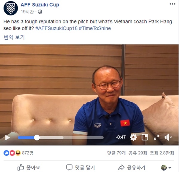 박 감독이 이끄는 베트남 축구 대표팀은 아세안축구연맹(AFF) 스즈키컵에서 라오스와 말레이시아를 차례로 꺾고 조별리그 2연승에 성공했다. 베트남은 올해 10년 만의 스즈키컵 정상에 도전 중이다. 21일엔 미얀마와 원정경기를 앞두고 있다.