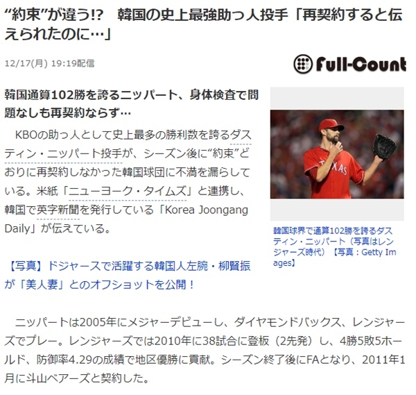 18일 일본 스포츠 매체 ‘풀카운트’ 인터넷판은 한국 영자신문을 인용 보도하며 “니퍼트는 2005년 메이저리그에 데뷔해 애리조나 다이아몬드백스, 텍사스 레인저스에서 뛰었다. 특히 2010년 4승5패 5홀드(평균자책점 4.29)를 거두며 지구 우승에 공헌했다”고 소개했다.