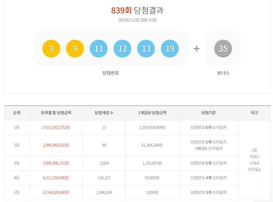 동행복권은 제839회 로또복권 추첨에서 ‘3, 9, 11, 12, 13, 19’가 1등 당첨번호로 뽑혔다고 29일 밝혔다. 2등 보너스 번호는 ‘35’다.
