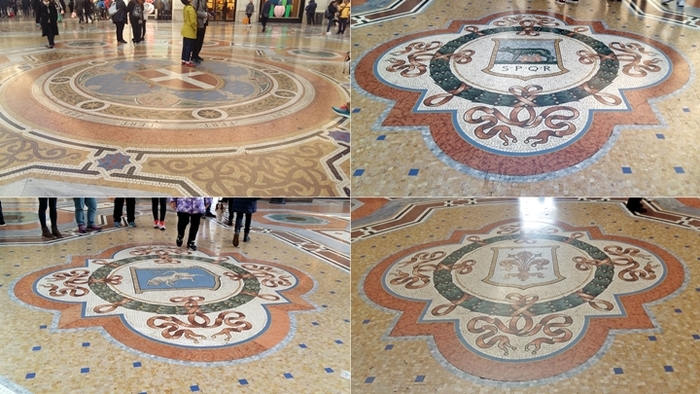 중앙의 교차로의 바닥에는 토리노, 피렌체, 로마 등 3개의 이탈리아 왕국에 밀라노를 더한 4개 도시의 문장을 모자이크로 새겨 넣었다. 그 중에 토리노의 문장에는 항상 많은 사람들이 몰려든다. 문장에 들어있는 황소의 고환을 발뒤꿈치로 밟고 세 번 돌리면 행운을 가져온다고 믿기 때문이다.