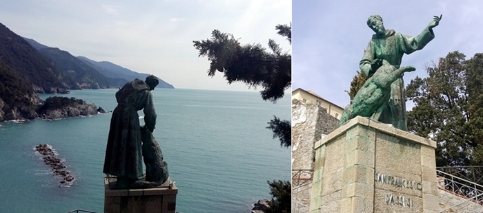 절벽 위에는 몸을 기울여 누군가를 굽어보는 동상이 서 있다. 절벽을 돌았을 때 본 마을까지 내려가려면 계단을 한참 내려가야 했다. 올라올 때 힘들 것 같아 차라리 누굴까 궁금해진 동상을 보러 올라가기로 했다. 문대현 인솔자는 절벽 위로 올라가는 것도, 내려오는 것도 힘들어 죽는 줄 알았다 한다. 그래도 올라가 보기로 했다. 가파른 계단을 숨이 턱에 닿도록 씩씩거리며 올랐다. 절벽 위의 동상은 아씨시의 프란체스코 성인이었다. 데리고 있는 개더러 멀리 바다를 바라보라고 부축이고 있었다. 동물까지도 사랑하는 모습이 잘 표현돼있다.