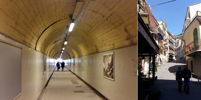 약속한 11시35분보다 훨씬 이르게 몬테로소로 역으로 갔더니 일행들이 모두 모여 있었다. 열차를 놓치면 1시간 뒤에나 오는 다음 열차를 타야 하기 때문에 늦은 사람은 두고 떠날 수밖에 없다고 미리 안내했기 때문일 것이다. 라 스페치아 행 열차로 되잡아 타고 마나롤라에서 내렸다. 마나롤라 역에서 마을로 가려면 터널을 한참 걸어야한다.