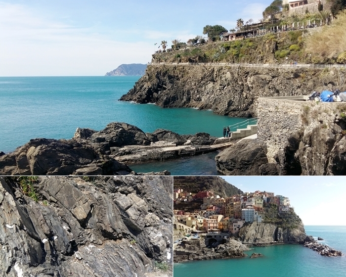 마나롤라 마을을 통하는 길을 따라 바다로 나가다보면 자연스럽게 마을 오른쪽 절벽 중턱에 나있는 길로 연결된다. 절벽의 모퉁이에 이르면 새로운 풍경이 ‘짠!’하고 나타난다. 절벽을 돌아가는 순간 세찬 바람에 몸이 날아갈 지경이다. 머리에 눌러쓴 모자가 벗겨지려는 순간 얼결에 붙들었다. 순발력은 아직도 그리 떨어지지 않았나 보다. 땀에 전 모자로 리구리아 바다가 오염되지 않아 다행이다. 여기서도 계단을 통해서 절벽 위로 올라가야 마나롤라 마을의 전경을 제대로 구경할 수 있다. 절벽을 계단식으로 일군 포도밭, 그리고 절벽을 이룬 바위들이 마치 오래된 고목의 나뭇결을 보듯 신기하다.