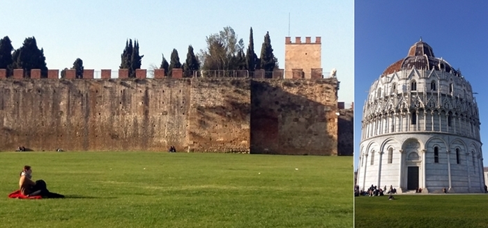 공영주차장에서 내려 한참을 걸어갔다. 주차장 길 양쪽으로 서있는 사이프러스 나무에는 열매가 다닥다닥 맺혀있었다. 이탈리아여행의 특징은 걷고 또 걷는다는 것이다. 목적지 부근에 주차는커녕 정차할 만한 공간이 없기 때문에 비교적 먼 곳에 있는 주차장에서 버스를 내려야 한다. 길을 따라가다 보니 성벽이 나오고, 성문을 지나 피사성에 들어서는 순간 그곳은 또 다른 공간이었다.