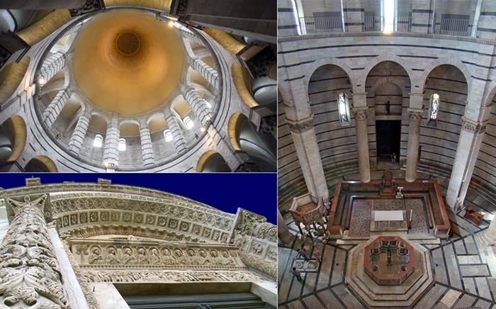 두오모 광장에서 처음 만나는 산 조반니 세례당(Battistero di San Giovanni)은 지름이 34.13m에 높이가 54.86m로 이탈리아에서 가장 규모가 큰 세례당이다. 세례당은 대성당과 종탑에 이어 1152년에 짓기 시작해 1363년에 완공됐다. 역시 모래가 많아 지반이 약한 까닭에 대성당 방향으로 0.6도 가량 기울어있다. 대리석으로 지은 세례당은 아래쪽은 둥근 아치를 둔 로마네스크 양식을 취했고, 위쪽은 뾰족한 아치를 둔 고딕양식을 적용한 특이한 건축물이다.