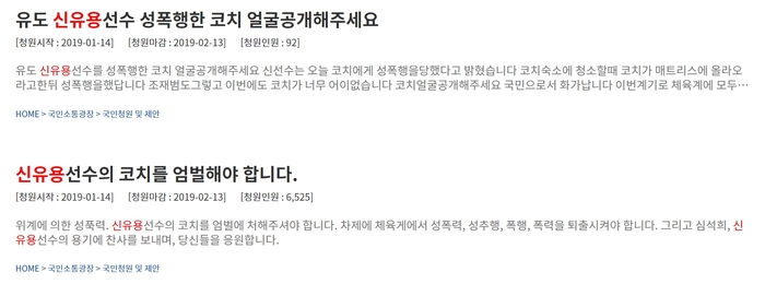 15일 오전 청와대 게시판에는 '신유용 코치를 엄벌해달라', '신유용 선수 성폭행한 코치 얼굴을 공개해달라' 등의 청원이 진행 중이다.