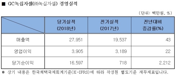 한편 2018년 4월 일본 세포치료제 선도기업 GC림포텍(Lymphotech Inc.)을 인수해 자회사 실적을 반영한 연결재무제표 기준 2018년 매출은 295억9000만원, 영업이익 37억9000만원, 당기순이익 168억6000만원을 기록했다.