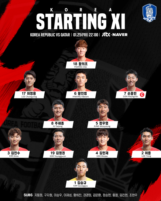 황인범(대전)이 2선 공격형 미드필더로 나서고 정우영(알사드), 주세종(아산)이 중원에 자리했다. 포백은 김진수(전북), 김영권(광저우), 김민재(전북), 이용(전북)이 쌓았다.