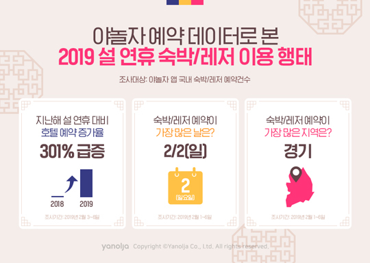 여가 플랫폼 야놀자는 2019년 설 연휴 국내 숙박 및 레저 시설 이용행태를 조사한 결과 명절여행이 보편화된 것으로 나타났다고 밝혔다.