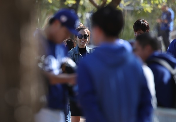 LA 다저스의 류현진이 19일(현지시간) 미국 애리조나주 글렌데일 캐멀백랜치의 스프링캠프에서 팬들에게 사인을 해주는 모습을 아내 배지현 아나운서가 지켜보고 있다.
