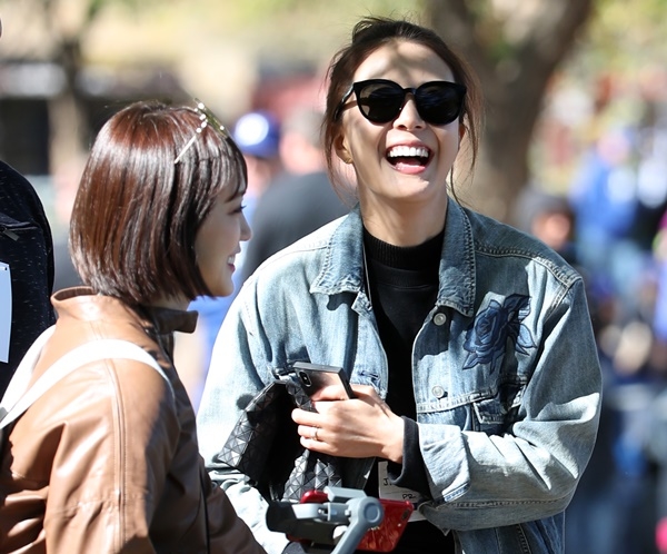 배지현 아나운서가 19일(현지시간) 미국 애리조나주 글렌데일 캐멀백랜치에서 열린 LA 다저스의 스프링캠프에서 정새미나 아나운서와 대화하며 웃고 있다.