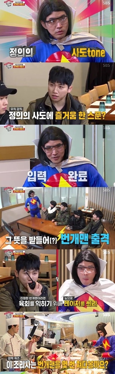 이상윤은 곧바로 ‘번개맨’ 역할에 몰입했다. 그는 “무슨 음식이 있는지 볼까?”라며 혼잣말로 독백하다가 홀로 앉아 먹방을 시작했다. 그는 “번개파워 레이저 빔”이라고 외치며 캐릭터를 즐기는 모습을 보여 웃음을 안겼다.