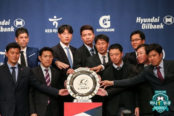26일 서울시 서대문구 홍은동 그랜드힐튼호텔에서 열린 ‘2019 K리그 개막 미디어데이’에 모인 K리그2 10개 팀 감독들 중 6명은 ‘우승 후보를 꼽아달라’는 질문에 부산을 꼽았다.