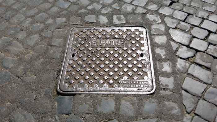 세나토리오 궁전의 왼쪽으로 돌아 경사로를 내려가다 보면 도로바닥에 놓인 쇠로 만든 맨홀 뚜껑에 SPQF라는 글자가 새겨져 있다. 이탈리아 사람들이 가장 자랑스럽게 생각하는 정치이념이라고 한다. 라틴어로 Senatus Populusque Romanus의 약자로 ‘로마의 원로원과 대중’을 뜻한다. 고대 로마 공화정 시기의 정부를 이르는 말이었다.